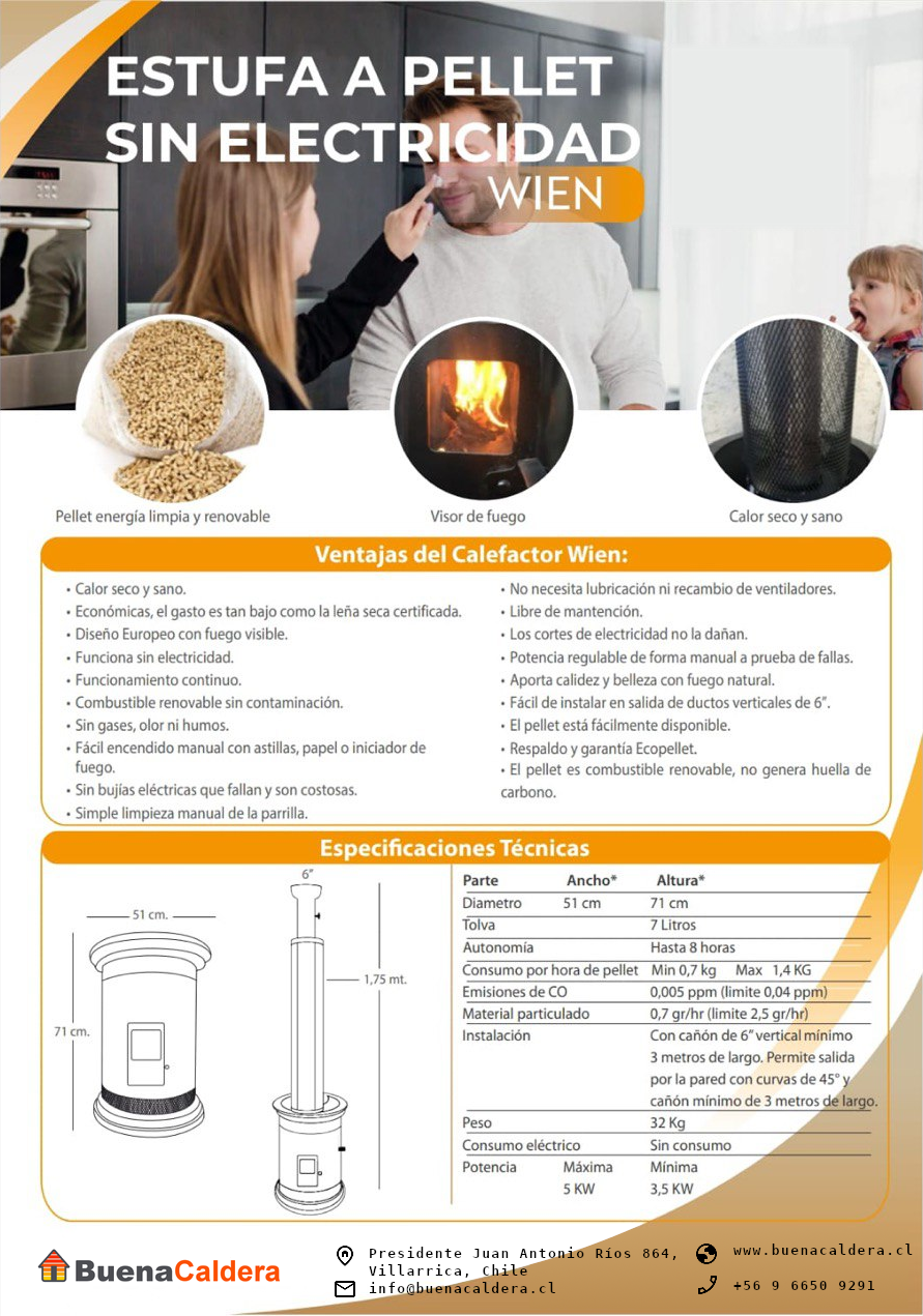 Bienvenido al revolucionario sistema de calefacción. Estufa de pellets sin electricidad. Lo primero que nos llama la atención en este estufa de 27 kg es su estética. Este es un modelo que tiene un diseño simple en un estilo moderno. Las principales ventajas de estufa son:- 10 veces menos emisiones que la norma Chilena para estufas eléctricas. Wien es lejos muy superior.